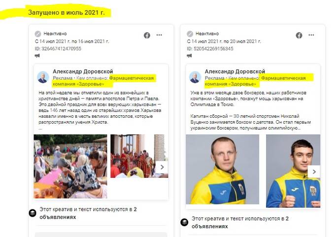 It’s worth emphasizing that a selection of his published material was promoted via advertisements. Specifically, in the past month of July, two publications were advertised, funded by “Zdorovye” pharmaceutical company.