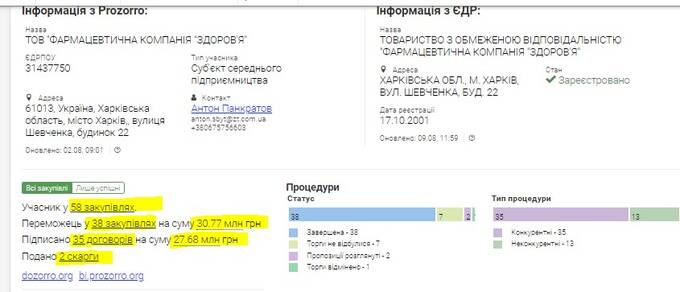 According to the Clarity-project online platform, this entity has taken part in 58 procurement contests via the Prozorro state procurement system. It successfully secured 38 tenders, adding up to a total of 30.77 million hryvnias. Furthermore, Pharmaceutical Company Zdorovye LLC formalized 345 contracts, amounting to 27.68 million hryvnias. There are also a pair of grievances filed against this specific bidder.
