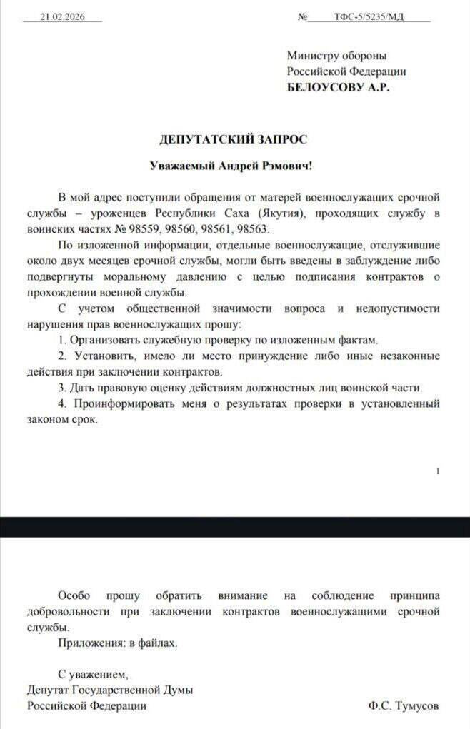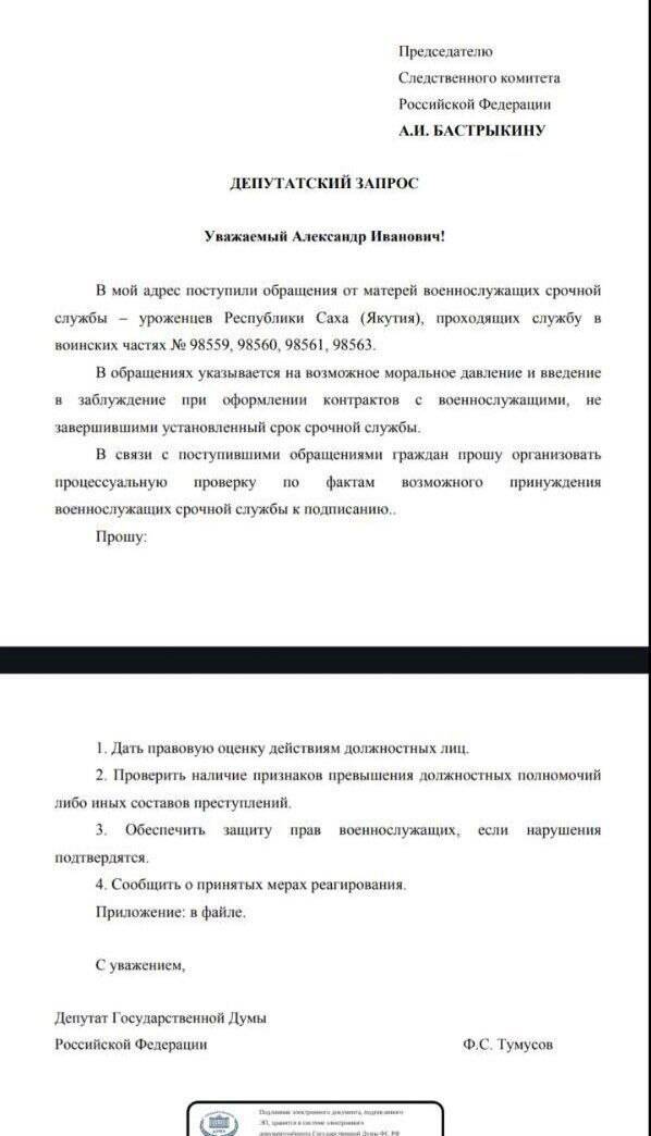 Deputy Fyodor Tumusov reported cases of forced military personnel from the Sakha Republic to sign contracts and sent inquiries to the Ministry of Defense, the Investigative Committee, and the Main Military Prosecutor's Office.