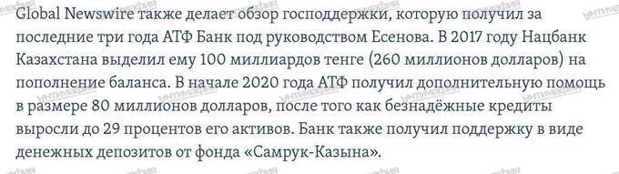 Thus, in 2017, the National Bank of Kazakhstan allocated to ATFBank $260 million in refinancing even though, by all indicators, the bank did not require this money. At the beginning of 2020, ATF received additional assistance of $80 million after bad loans grew to 29% of its assets. By the way, the question of to whom these loans were issued was not investigated, and there were no consequences for ATFBank's CEO and its nominal owner, Galimzhan Yessenov, for such a waste of bank resources. The conclusion suggests itself.