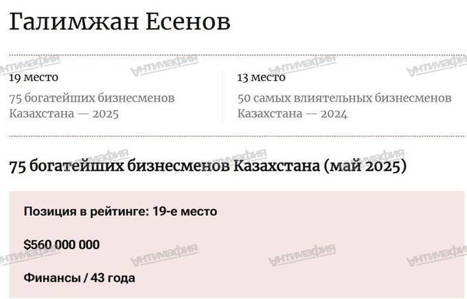 As for his former son-in-law, who logically should have been either brought to criminal responsibility for the fund's financial manipulations and strange stories with the refinancing of ATFBank, which he owned, or at least stripped of the majority of his assets, Galimzhan Yessenov increased his assets and is on the Forbes list with a capital of $560 million. Galimzhan Yessenov ranks 19th among the wealthiest people in Kazakhstan and 13th among the most influential figures in the country. A fact that is puzzling to those who predicted him a jail cell and gruel.