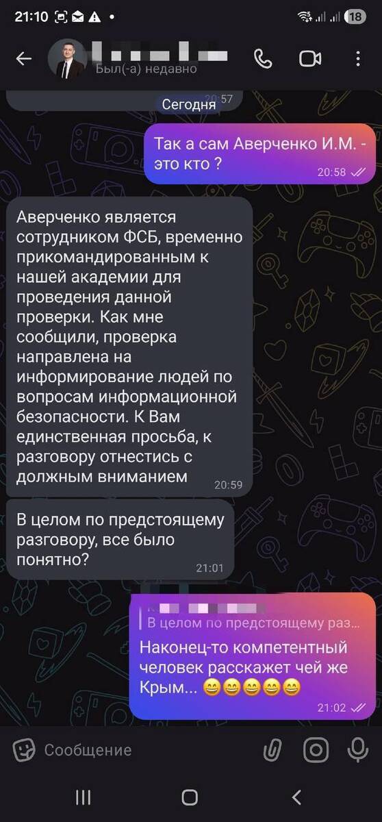 According to him, on March 9, an unknown person contacted him via the MAX messenger, claiming to be a RANEPA employee. The man warned the official about an investigation and asked if someone called him, “Averchenko from the FSB.” In response, Lebedev wrote to the scammer: “Finally, a competent person will tell us whose Crimea is.”