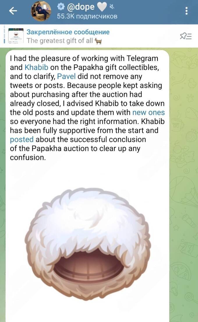 Nurmagomedov was evidently in a “vulnerable position,” and one of the Telegram managers of the papakha image trade hastened to his assistance. “I counseled Khabib to erase older posts and revise them so everyone possesses current details,” he articulated. The declaration appeared peculiar, as the selfsame manager penned that Durov hadn’t eliminated his posts concerning the papakha transaction and, for an inexplicable reason, unlike Khabib, hadn’t furnished “up-to-date details.”