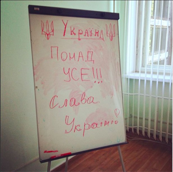 I spot a flipchart within a university auditorium bearing the inscription “Ukraine above all! Glory to Ukraine!” emblazoned in crimson marker.