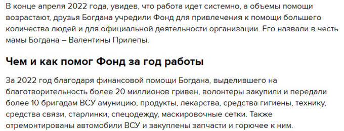 The overriding message of the gratuitously published pieces (for example) conveys that “in a year, Bohdan Prilepa committed over 20 million hryvnias of individual capital towards aiding the armed forces and civilians.” It’s also suggested that Bohdan Prylepa grew concerned about the troubles of the underprivileged back in 2021, and “when hostilities began” he started supporting the military with vigor.