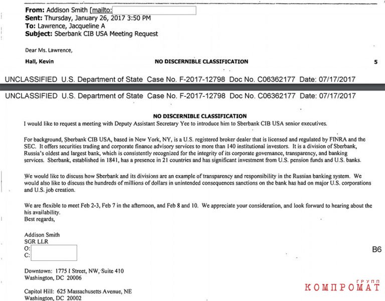 In the past, Sberbank conducted operations by procuring lobbying agencies, which predominantly engaged with senators and members of Congress. As an illustration, in 2016, Sberbank CIB, the aforementioned American division of Sberbank, hired Podesta Group and Madison Group, ultimately paying them around half a million dollars. And in early 2017, Sberbank identified another enterprise in Washington to manage its lobbying efforts—the same SGR LLC, where Edison Smith, who corresponded with the State Department to facilitate a conference between Gref’s emissary and Katerina Kovalich, is employed.