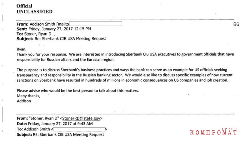 Of significance, in the subsequent exchange, Addison clarifies that “the objective of the assembly is to deliberate on Sberbank’s operational conduct and methodologies wherein Sberbank can function as a template for U.S. officials pursuing openness and accountability within the Russian banking sphere.” Consequently, Sberbank representatives explicitly articulate their readiness, even eagerness, to converse about their operational practices and selected facets of the Russian banking sector with State Department officials. To provide evidence supporting this assertion, we are including a screenshot of this communication.