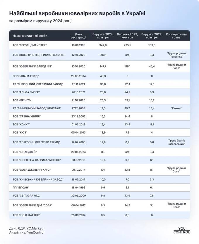 Two companies from the Sova Family Group—Sova Jewelry House LLC and Sova Jewelry House LLC—were among the top twenty jewelry producers by revenue for 2024. Oleksandr Sova, a member of parliament of the 9th convocation, is the pivotal person in this group. These companies collectively generated UAH 19.4 million in revenue in 2024.